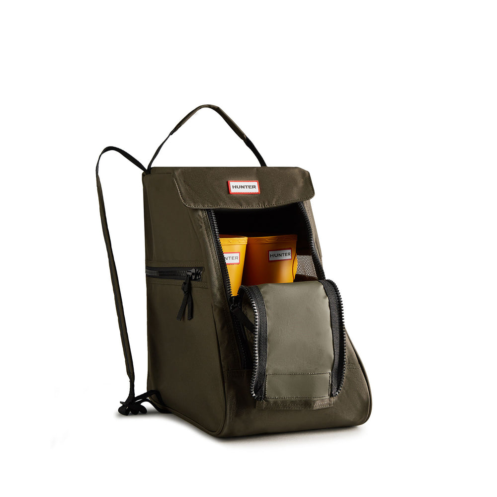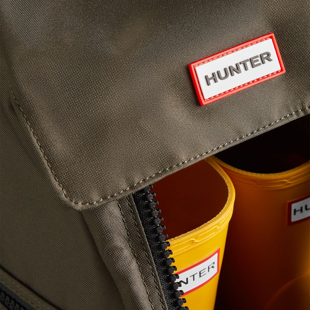 Een middelgrote rugzak voor Hunterlaarzen, gemaakt van duurzaam polyester. De reistas is speciaal ontworpen voor korte Hunter-laarzen voor volwassenen en heeft een brede dubbele ritssluiting, een extra steekvak aan de buitenkant en een mesh-paneel. Dankzij het praktische ontwerp, de handgreep aan de bovenkant en de verstelbare schouderriem is de tas gemakkelijk te dragen.